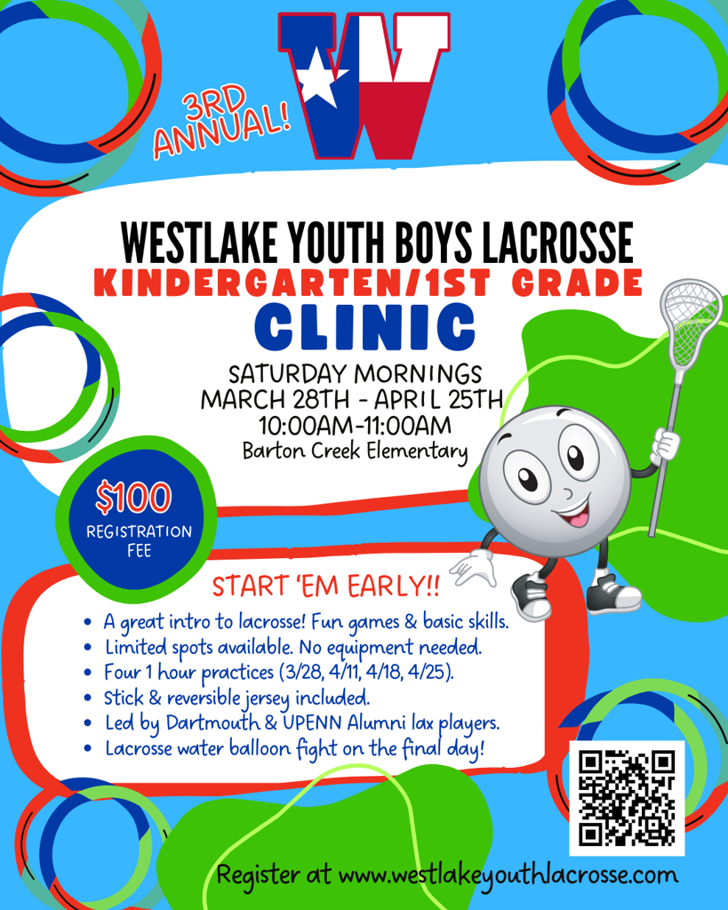 Westlake Youth Boys Lacrosse is dedicated to providing the best Lacrosse experience to the youth of the community of Westlake Hills in Austin, Texas. Our mission is to foster, promote and teach boys, grades 1 thru 8, a love for the game of Lacrosse as well as become proficient and skilled players. We strive to provide maximum opportunity for all eligible individuals to participate in a healthy, positive and safe environment with a strong focus on moral conduct, sportsmanship, and teamwork.
